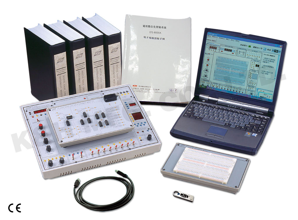 ETS-8000A 是一套基礎的數位邏輯電路實驗系統。 它包括組合邏輯和時序邏輯實驗電路,內容有硬體實作和軟體模擬。主機上備有了數位邏輯實驗所需的設備,例如電源、訊號產生器、指示器、測量裝置。